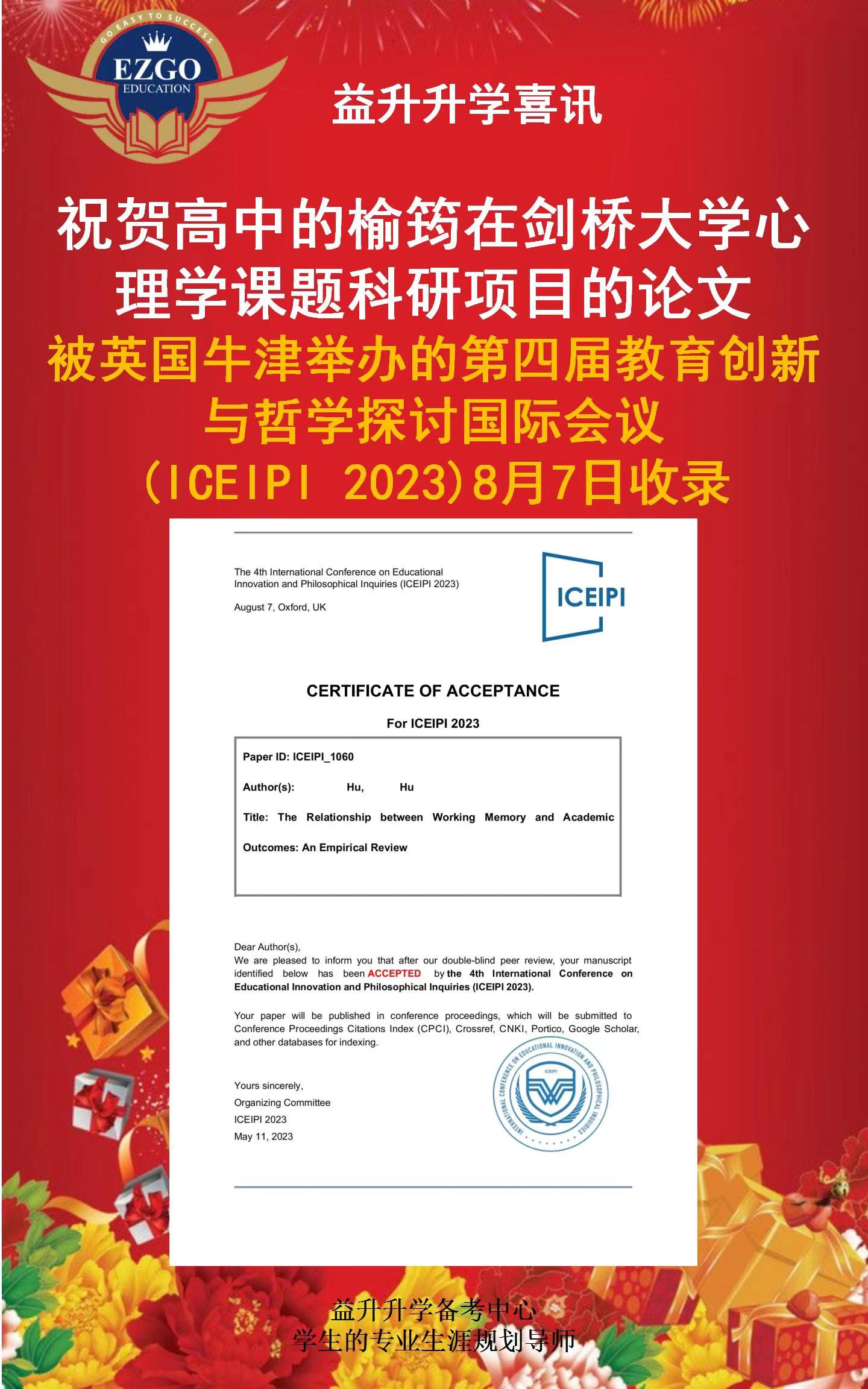 祝贺高中的榆筠在剑桥大学心理学课题科研项目的论文被英国牛津大学举办的《第四届教育创新与哲学探讨国际会议》